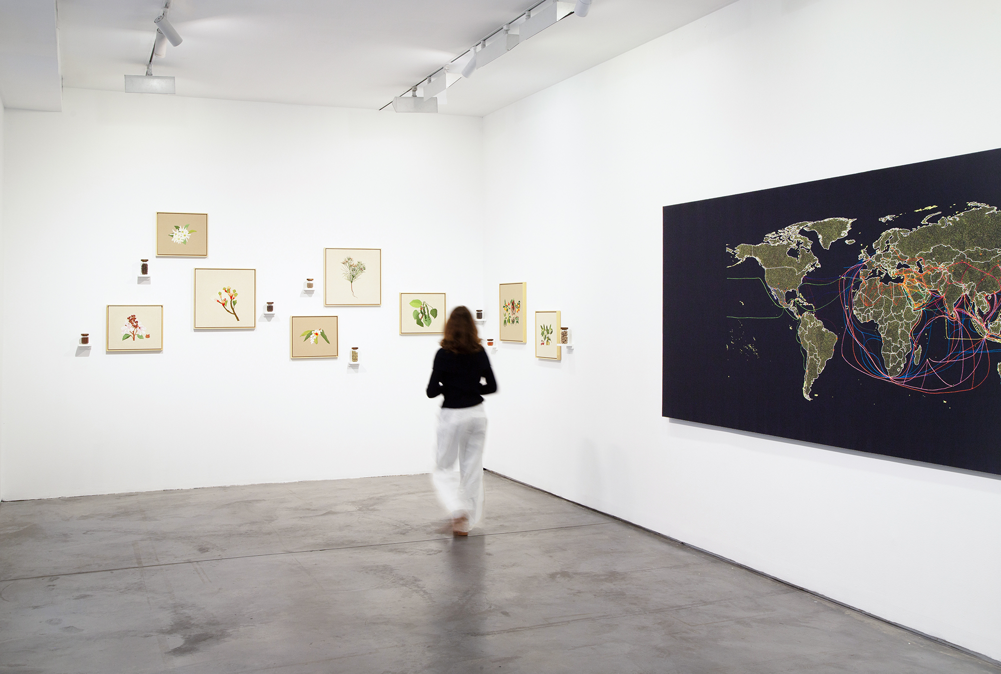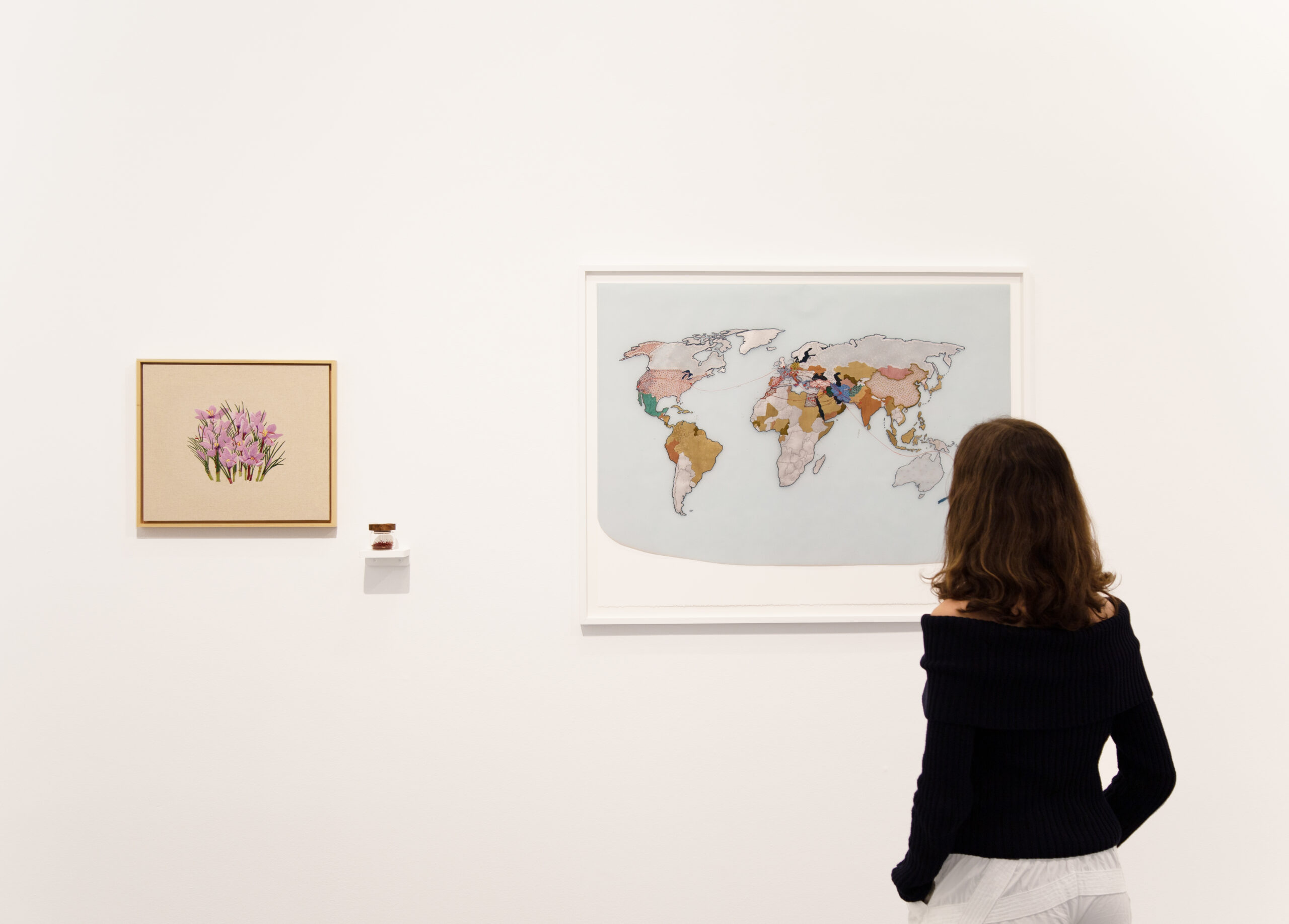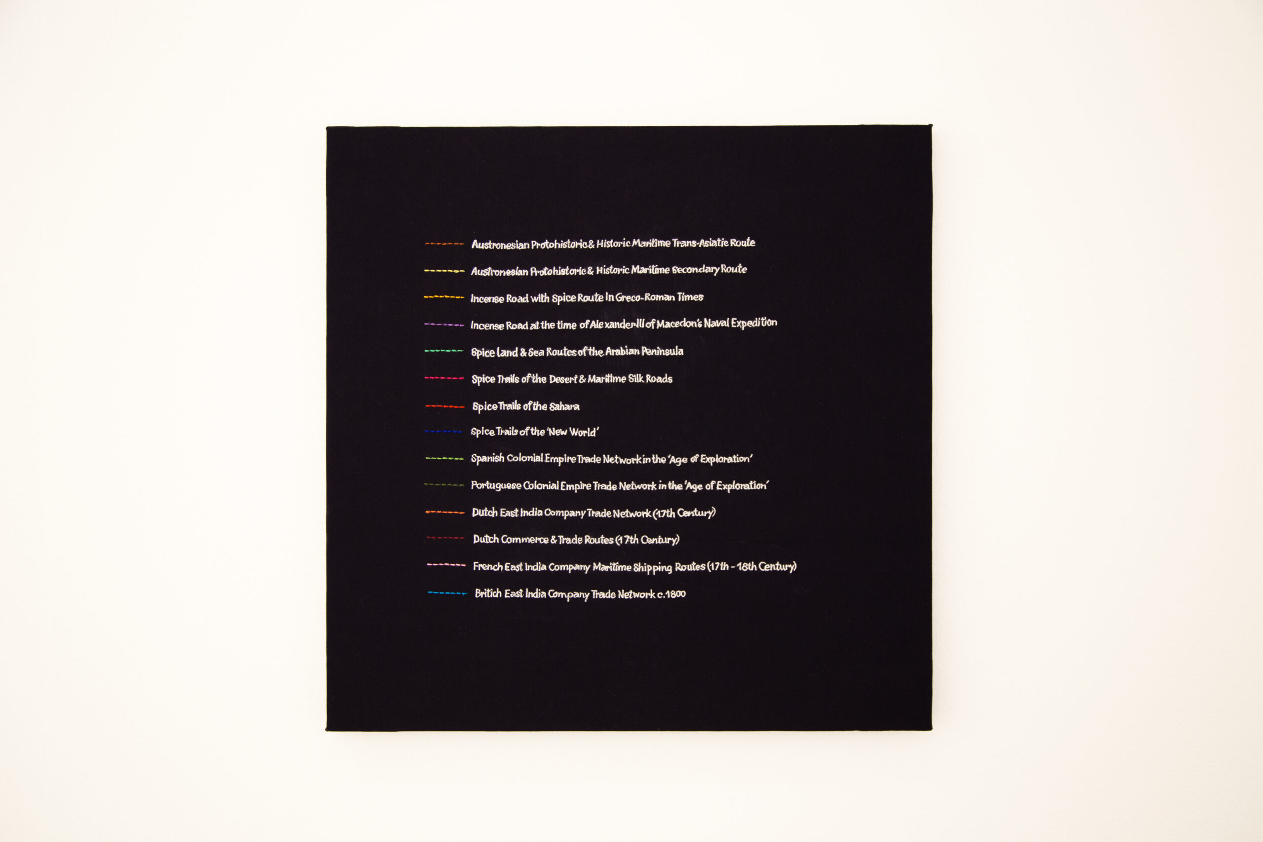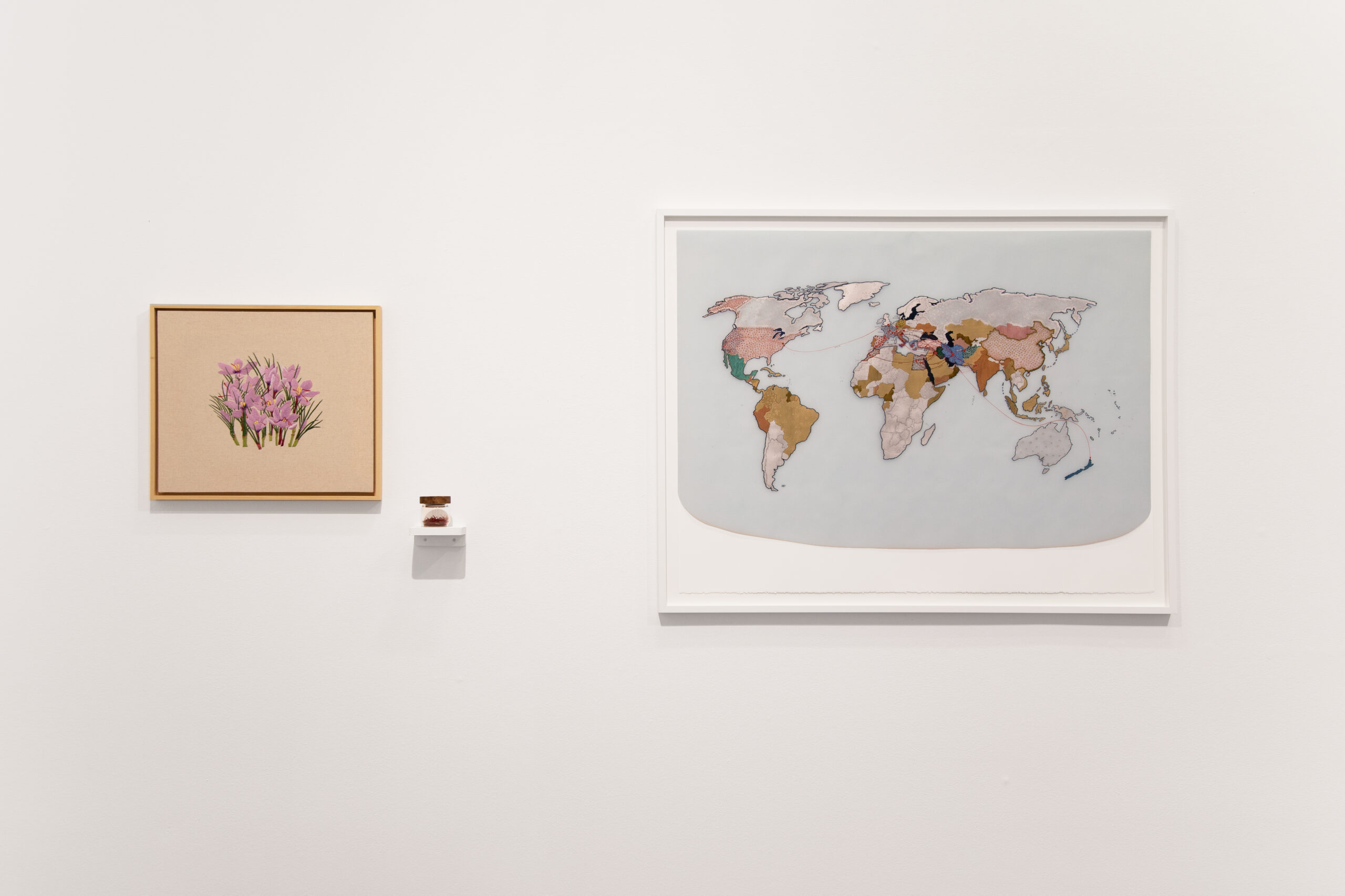 Abordando la historia global del comercio de especias como un tejido de gran tamaño, la investigación de Chung busca desenmarañar y enlazar los hilos económicos, culinarios y políticos que lo han formado a lo largo de varios milenios. ‘Me interesa observar las trayectorias de las especias a través del tiempo y el espacio mediante las rutas comerciales, recetas, migraciones humanas, adaptaciones lingüísticas y culturales, y conflictos.’ Para representar las caóticas rutas globales de especias que conectan Asia, África, Europa y América, Chung recopiló datos de múltiples fuentes de mapas y utilizó Google Sheets, Google Maps y QGIS para crear el mapa base. El mapa final de la ruta de las especias y los estudios visuales de estos organismos botánicos presentados en la exposición fueron creados utilizando el oficio tradicional del bordado. ‘Este laborioso proceso contempla la complejidad de la historia del comercio de especias y los roles que desempeñó en la conformación de la globalización a través del comercio, el desarrollo marítimo, los conflictos y el colonialismo que condujeron al capitalismo moderno.’ Otros trabajos del proyecto prestan especial atención a las especias utilizadas en la cocina española, reconociendo a España como un cruce histórico en la expansión global del azafrán, entre otras especias.