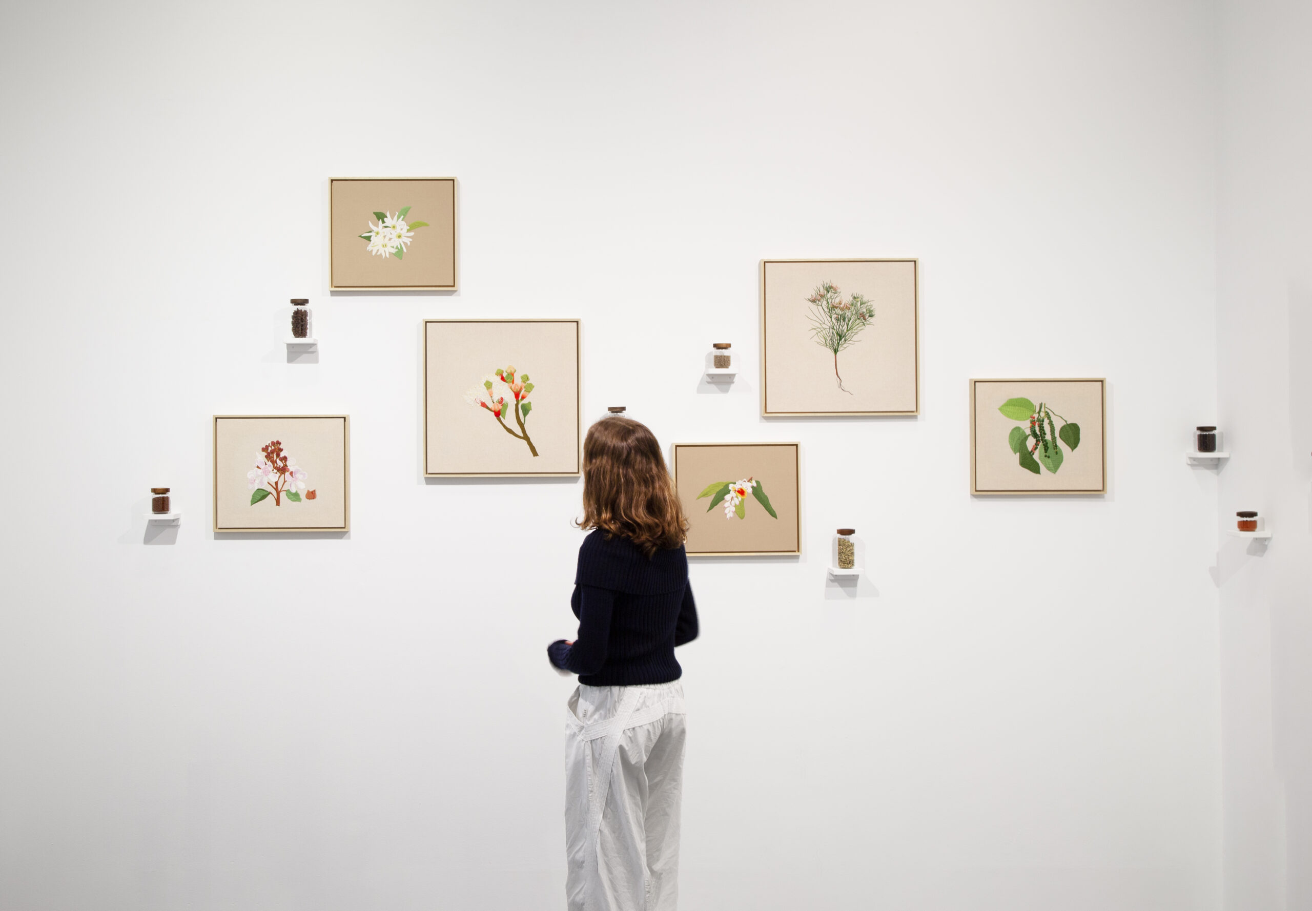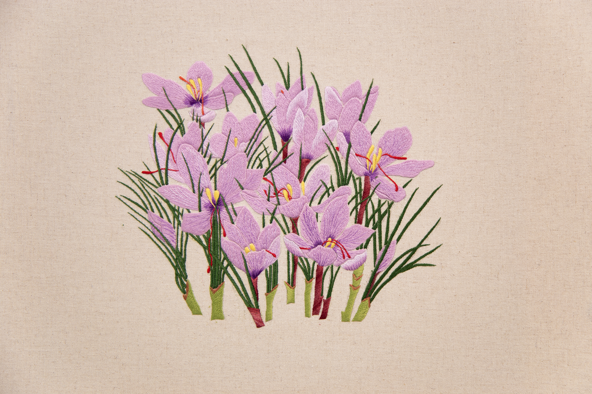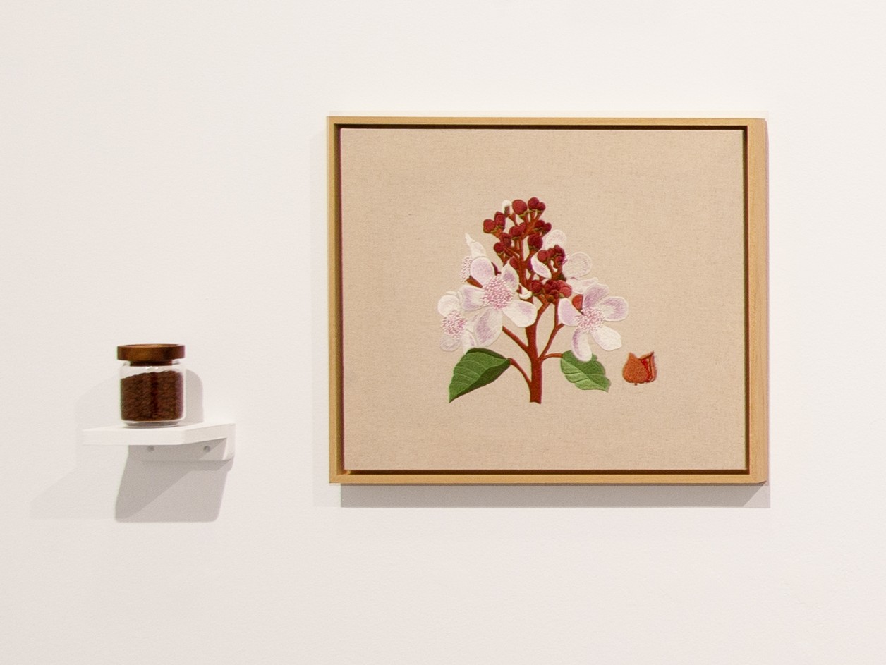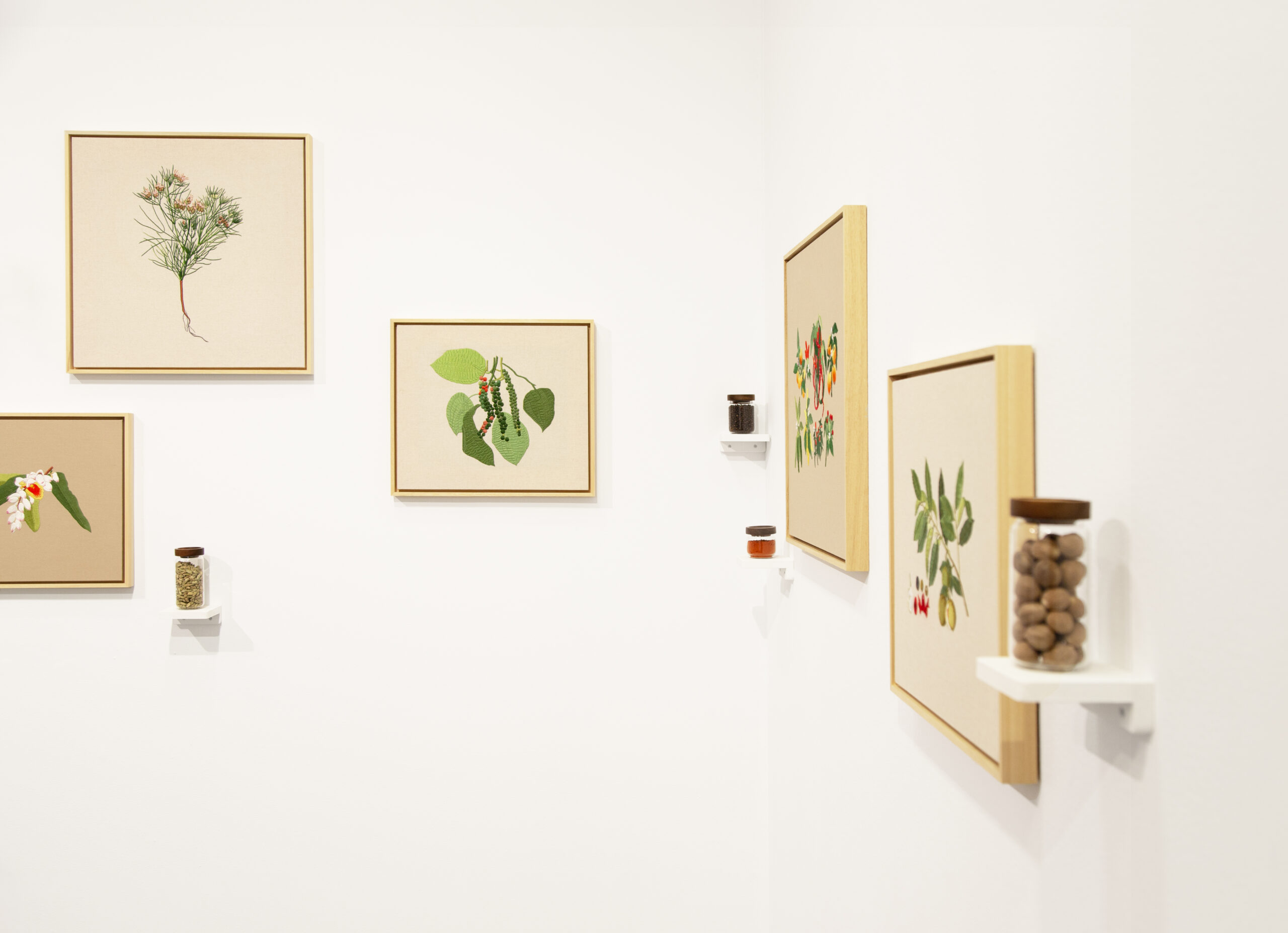 Abordando la historia global del comercio de especias como un tejido de gran tamaño, la investigación de Chung busca desenmarañar y enlazar los hilos económicos, culinarios y políticos que lo han formado a lo largo de varios milenios. ‘Me interesa observar las trayectorias de las especias a través del tiempo y el espacio mediante las rutas comerciales, recetas, migraciones humanas, adaptaciones lingüísticas y culturales, y conflictos.’ Para representar las caóticas rutas globales de especias que conectan Asia, África, Europa y América, Chung recopiló datos de múltiples fuentes de mapas y utilizó Google Sheets, Google Maps y QGIS para crear el mapa base. El mapa final de la ruta de las especias y los estudios visuales de estos organismos botánicos presentados en la exposición fueron creados utilizando el oficio tradicional del bordado. ‘Este laborioso proceso contempla la complejidad de la historia del comercio de especias y los roles que desempeñó en la conformación de la globalización a través del comercio, el desarrollo marítimo, los conflictos y el colonialismo que condujeron al capitalismo moderno.’ Otros trabajos del proyecto prestan especial atención a las especias utilizadas en la cocina española, reconociendo a España como un cruce histórico en la expansión global del azafrán, entre otras especias.