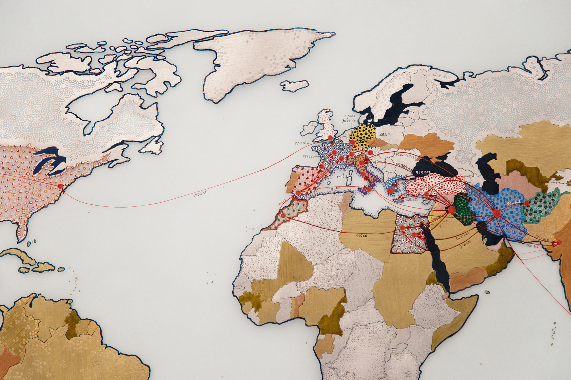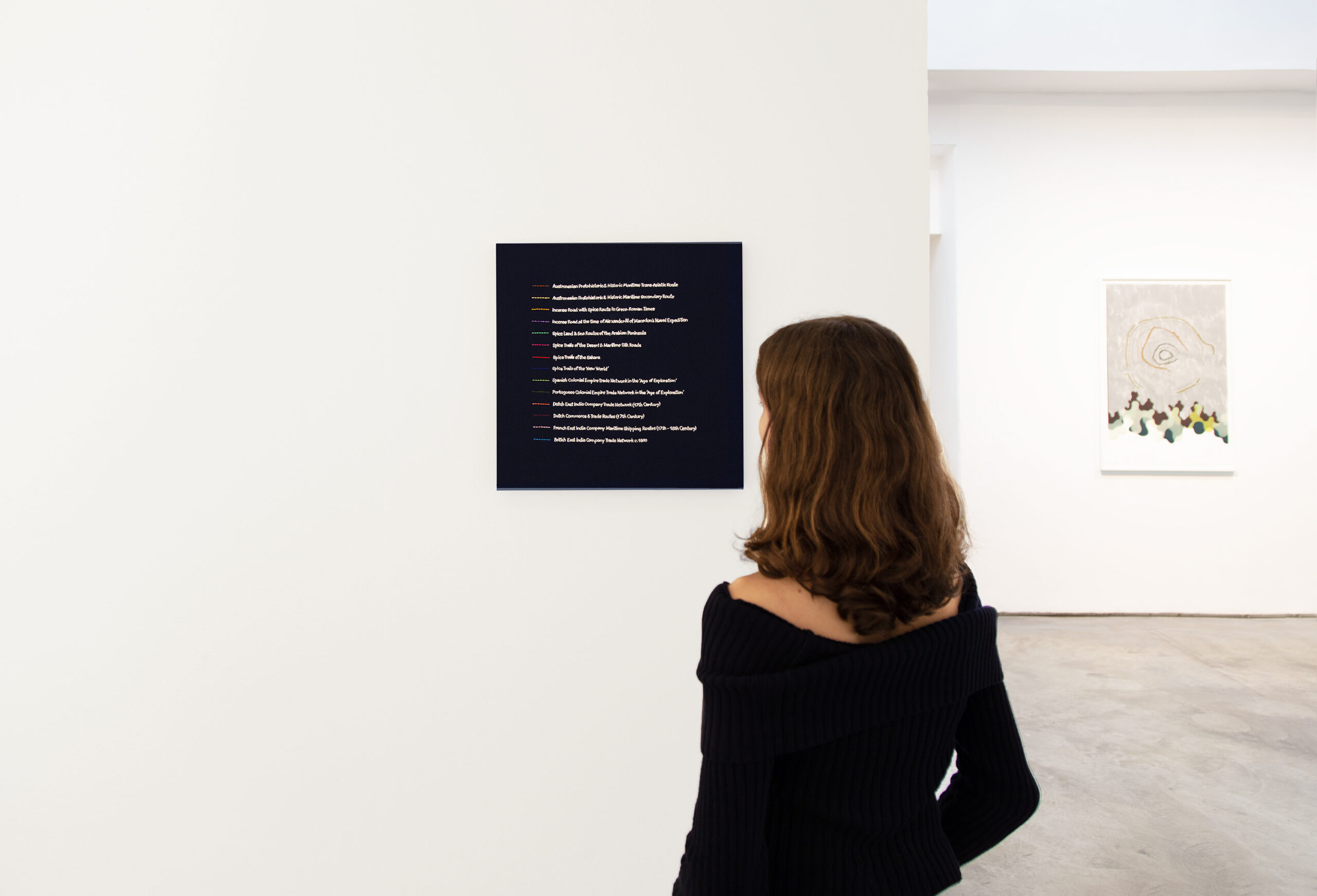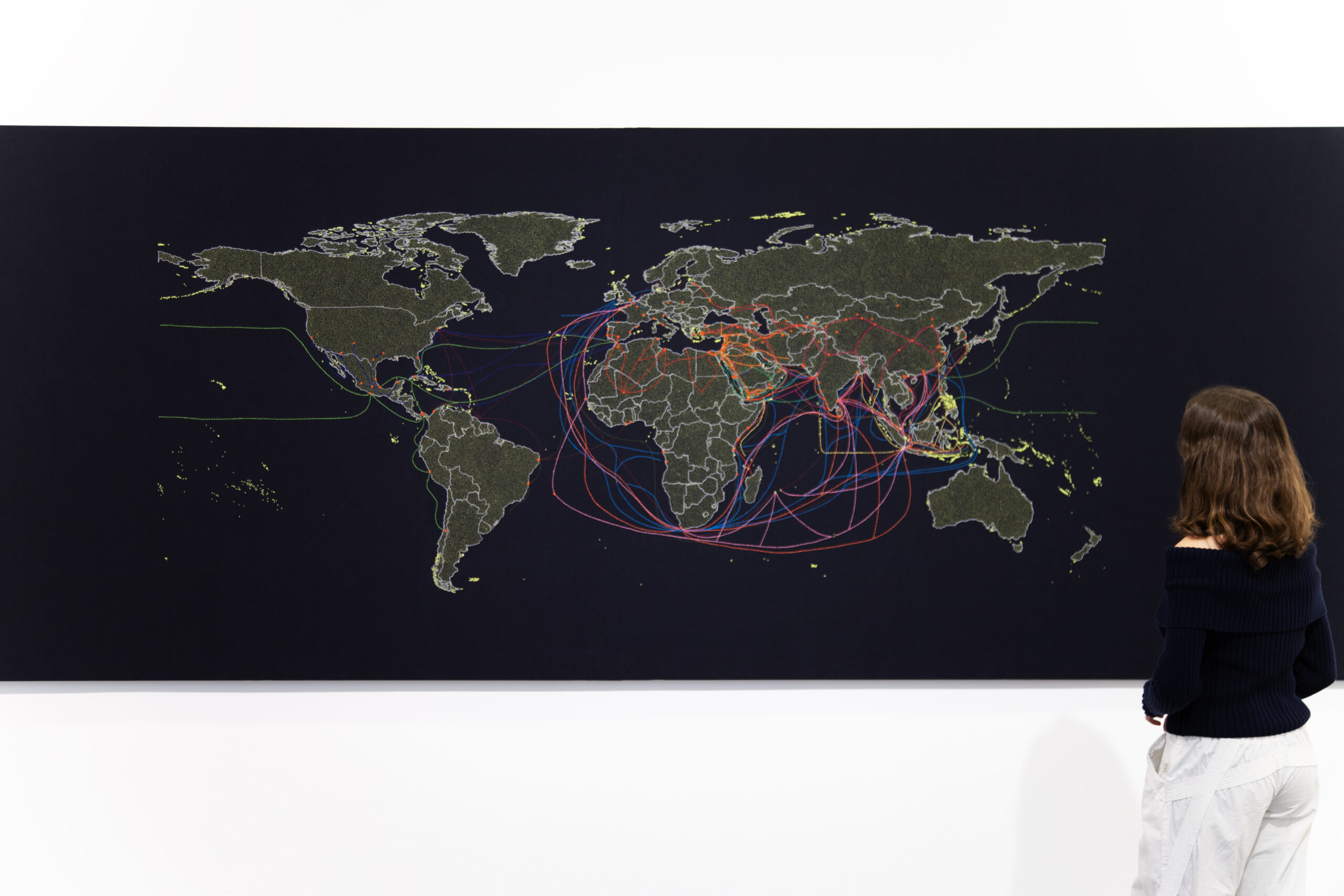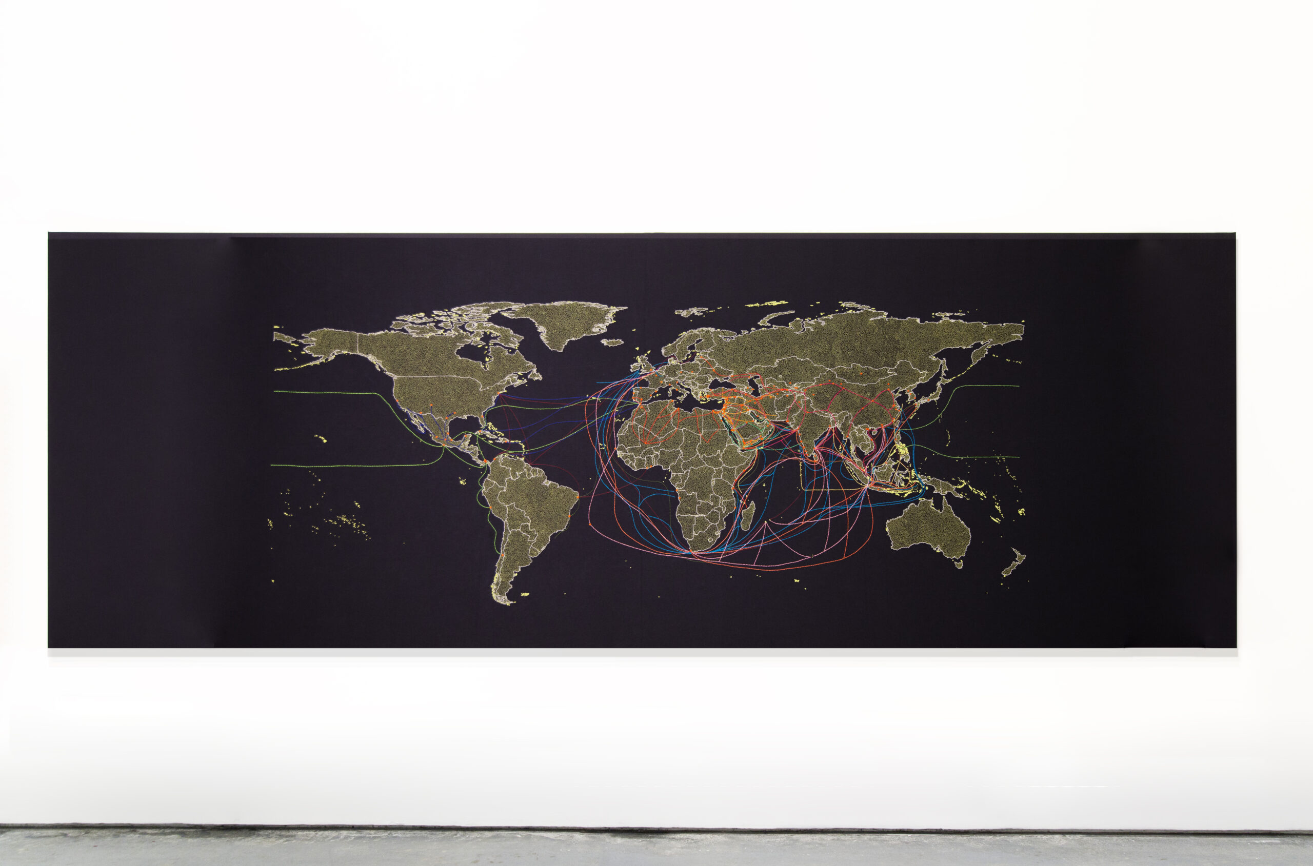 Max Estrella se complace en presentar Crossroads of Time, la primera exposición individual en España de la reconocida artista vietnamita-estadounidense Tiffany Chung. Viviendo y trabajando tanto en Vietnam como en los Estados Unidos, Chung ha desarrollado una práctica interdisciplinaria basada sus investigaciones a largo plazo sobre un complejo marco de procesos sociales, políticos, económicos y ambientales, entrelazados con la arqueología del paisaje y la ecología histórica. Chung materializa sus estudios en mapas hechos a mano y bordados, pinturas, fotografías, esculturas y videos. Si bien gran parte del trabajo de Chung se ha centrado en conflictos, desastres naturales y antropogénicos, desplazamientos y migración, sus proyectos recientes se enfocan en aprender sobre los tiempos profundos de la Tierra, la monumentalización del paisaje prehistórico y las antiguas conexiones globales a través de rutas de comercio de especias de 3,500 años de antigüedad.