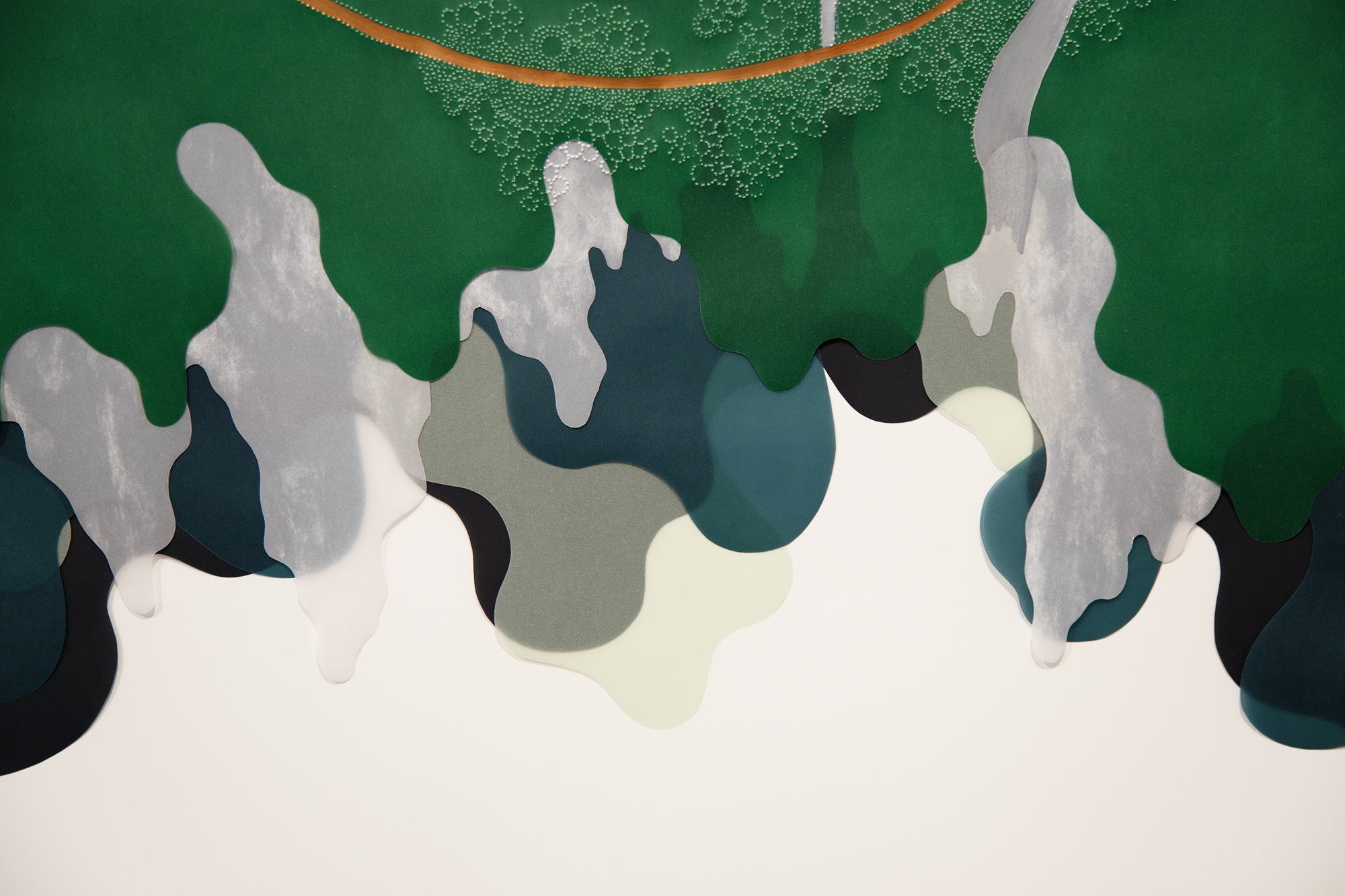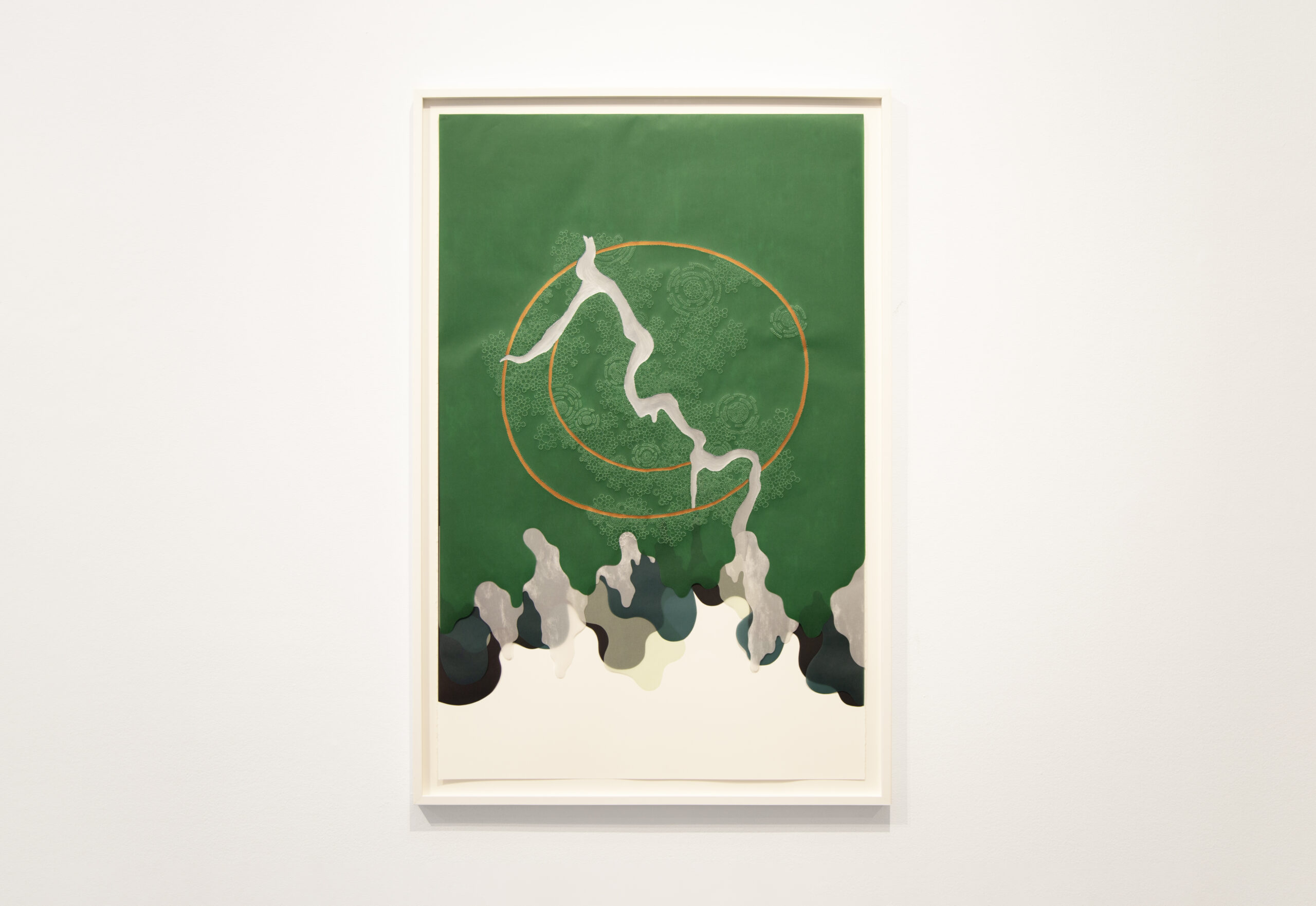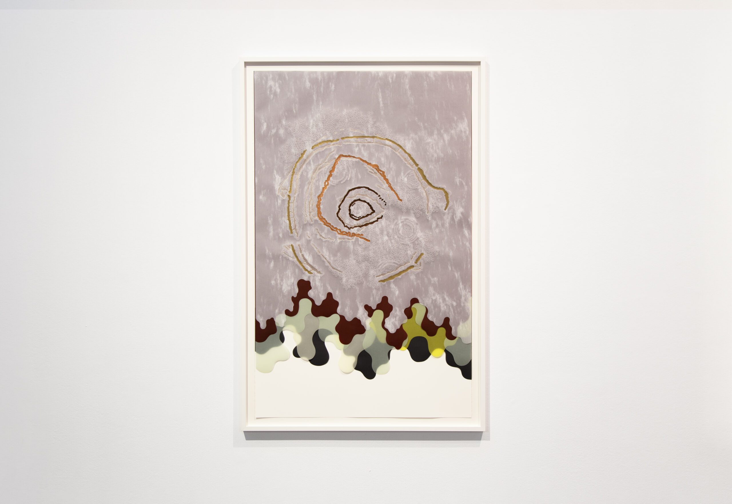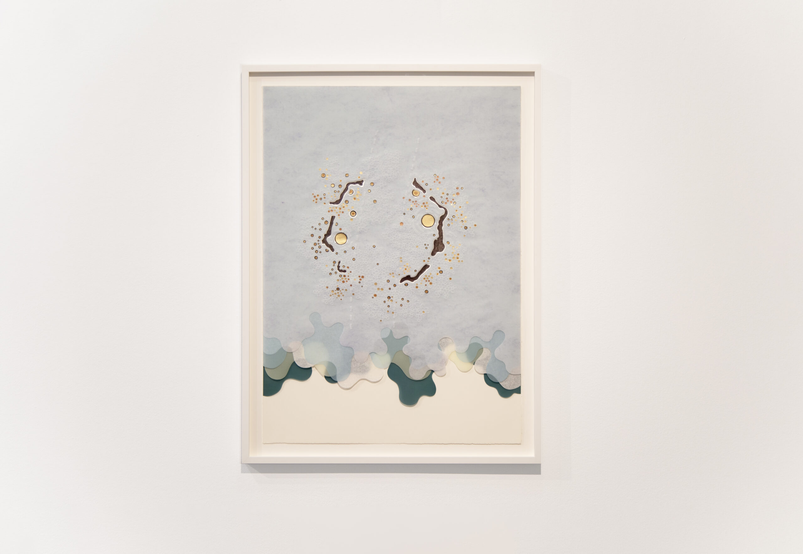 Profundizando más en las antiguas conexiones globales, la exposición incluye una serie de trabajos sobre papel de la artista. Estas piezas toman como base su investigación continua sobre los trabajos de tierra circulares neolíticos (2300-300 a.C.) en el sureste de Vietnam y Camboya, en comparación con los cercos con zanjas encontrados en Europa desde el Neolítico temprano (6000 a.C.) hasta el Calcolítico (3000 a.C.), especialmente en la Península Ibérica. Buscando comprender la morfología y el uso de estas excavaciones, Chung traza los restos casi invisibles de muros de tierra o zanjas y fosas en capas superpuestas de papel. A través del corte, el dibujo y la pintura, Chung trabaja estas piezas delicadas para evocar la manera en que los arqueólogos excavan cuidadosamente los sitios para revelar las capas estratigráficas de la Tierra. ‘Espero que el estudio de las prácticas de trabajo de tierra en Asia y Europa nos informe sobre las interconexiones globales en tiempos prehistóricos, similar a las formas en que las antiguas rutas comerciales y los restos arqueobotánicos de especias encontrados en todo el mundo han demostrado que el proceso de globalización comenzó mucho antes de la llamada Edad de la Exploración en el siglo XV.’