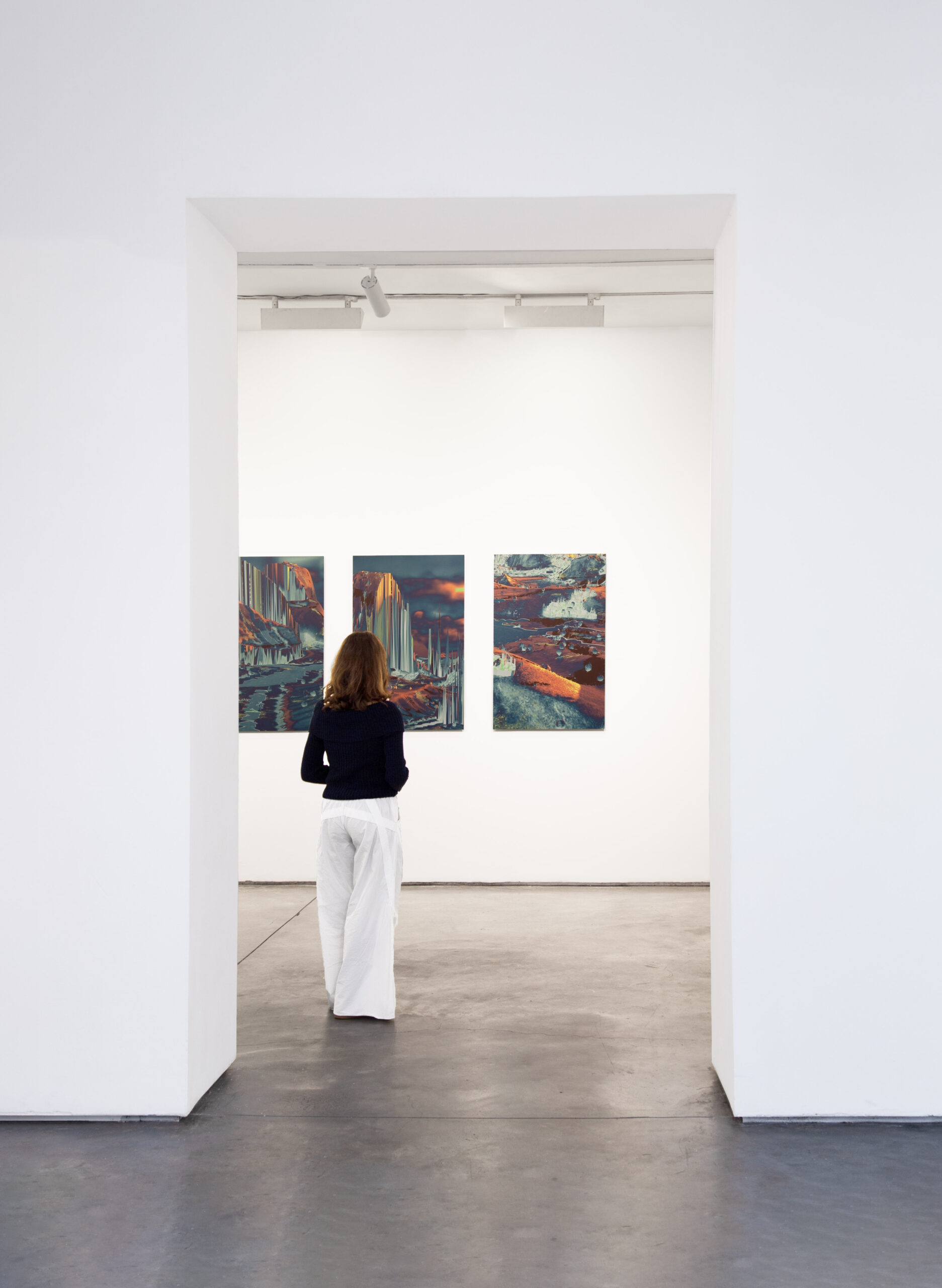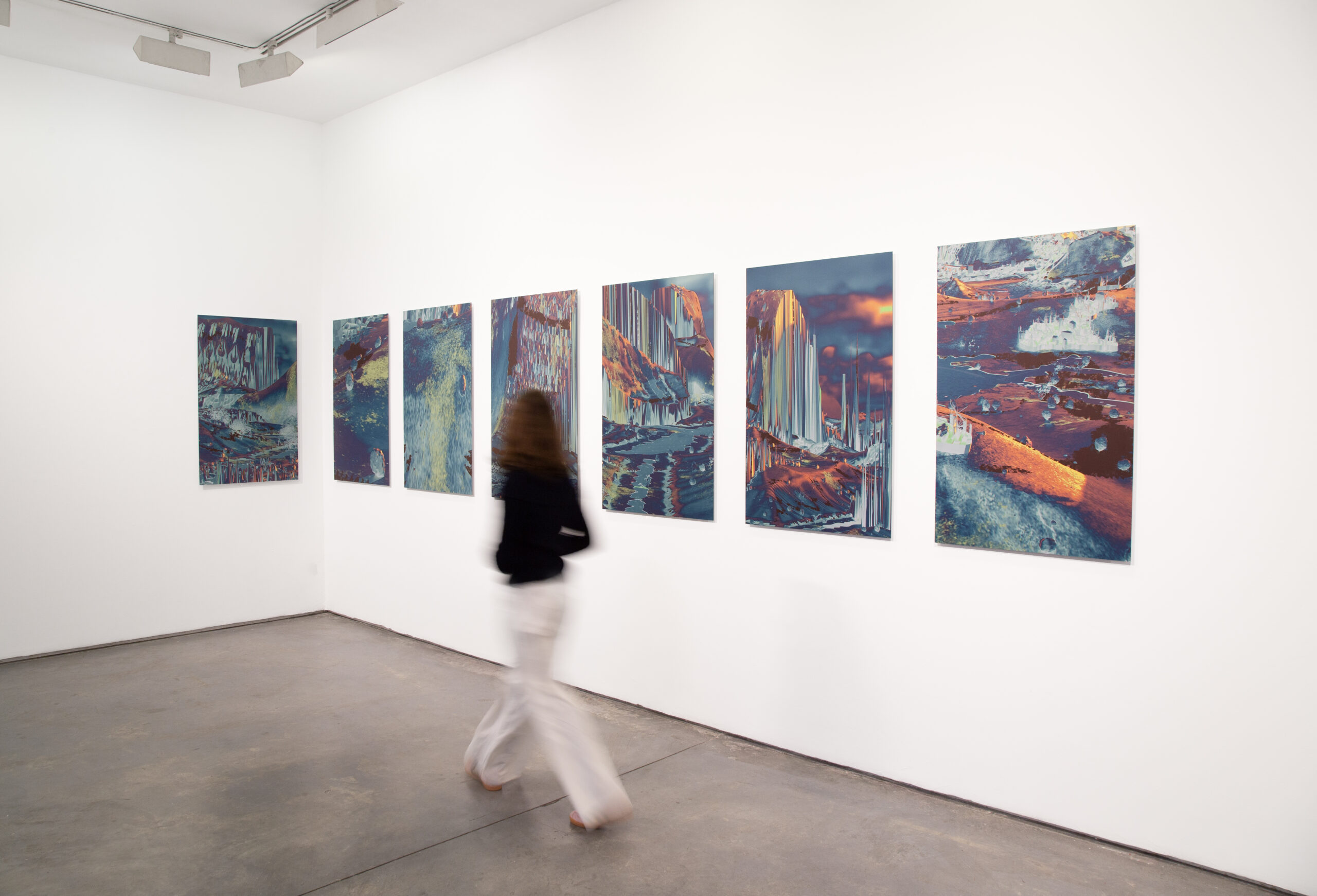 Explorar cómo los alimentos, los idiomas y las culturas fueron intercambiados y adaptados a través de los comerciantes anónimos muestra cómo la migración ha sido parte del proceso de globalización desde la antigüedad, entrelazada con los cambios culinarios, culturales, ambientales, socioeconómicos y políticos a lo largo de la historia. Dado que los temas del desplazamiento y la migración también han sido centrales en la práctica de Chung, la artista reconoce la importancia de tomar el control de la narrativa, ya que la migración forzada a menudo está estigmatizada en un mundo saturado de imágenes de conflictos y violencia. En la última sala de la galería, los visitantes encuentran una adaptación del proyecto Rise into the Atmosphere, actualmente en exhibición en el Museo de Arte de Dallas. El proyecto tiene como objetivo cambiar la perspectiva de las personas sobre los lugares conocidos como ‘zonas de conflicto’ y desafiar el estigma social asociado a los refugiados, destacando la agencia de las personas y recordándonos la belleza, la fortaleza, la esperanza y la humanidad enterradas debajo de la inhumanidad de esos lugares. Encapsulando la complejidad de las memorias personales y culturales, este proyecto comprende dos obras: una instalación inmersiva de audio, Composition X (2022; 20 minutos), y su correspondiente visualización, Poetic Landscapes Remembered (2023). Composition X entrelaza sonido, música y poesía creados en colaboración con 27 participantes de todo el mundo, inspirados en sus recuerdos del hogar y/o la experiencia del desplazamiento. En Poetic Landscapes Remembered, Chung investiga los campos sónicos invisibles de Composition X, utilizando software de animación 3D para moldear y traducir sus frecuencias sonoras en un video paisajístico, destilando fotogramas seleccionados en elementos impresos que forman un collage de texturas y patrones. Mientras los visitantes se mueven por el espacio rodeados de estos paisajes y sonidos, atraviesan un terreno sensorial, evocador e inmersivo, explorando las posibilidades poéticas, sonoras y visuales arraigadas en los recuerdos de otros, y posiblemente de ellos mismos.
