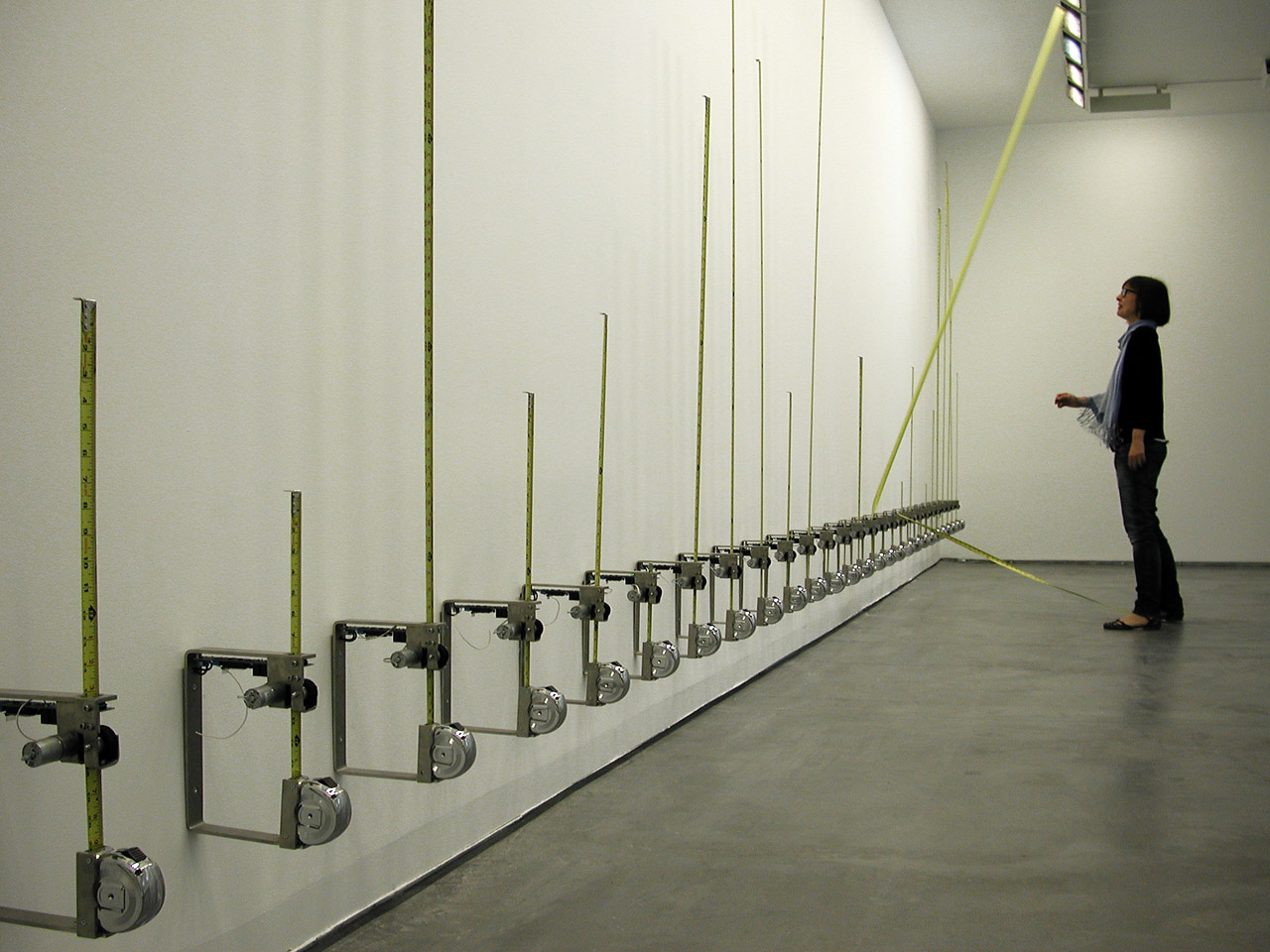Una muestra de ello es la pieza principal de la exposición: Tape Recorders. En la que una serie de cintas métricas registran la cantidad de tiempo que los visitantes permanecen en la instalación. Cuando detecta la presencia de una persona, la cinta métrica más cercana empieza a subir. Cuando la cinta llega a unos 3 metros de altura, cae, chocando contra el suelo y se enrolla de nuevo. Como una metáfora de una ciudad en crecimiento, que llega un momento en que se colapsa y derrumba. Cada hora, el sistema imprime el número total de minutos pasado por la suma de todos los visitantes.