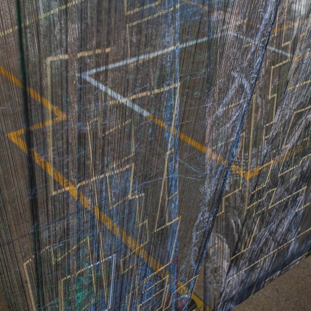 En este marco, Artefacto para urdir un destelar, instalación de Leyla Cárdenas, se despliega en el antiguo edificio de Coltabaco con telas semitransparentes sublimadas y parcialmente destramadas, configurando un sistema espacial donde fibras, paisajes e imágenes industriales convergen en un bucle de tiempo y memoria.