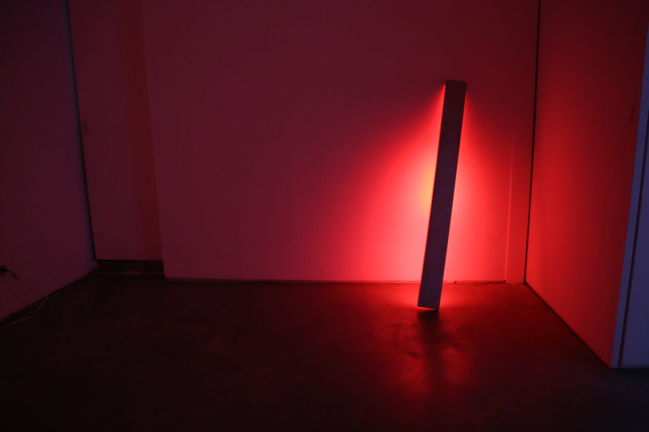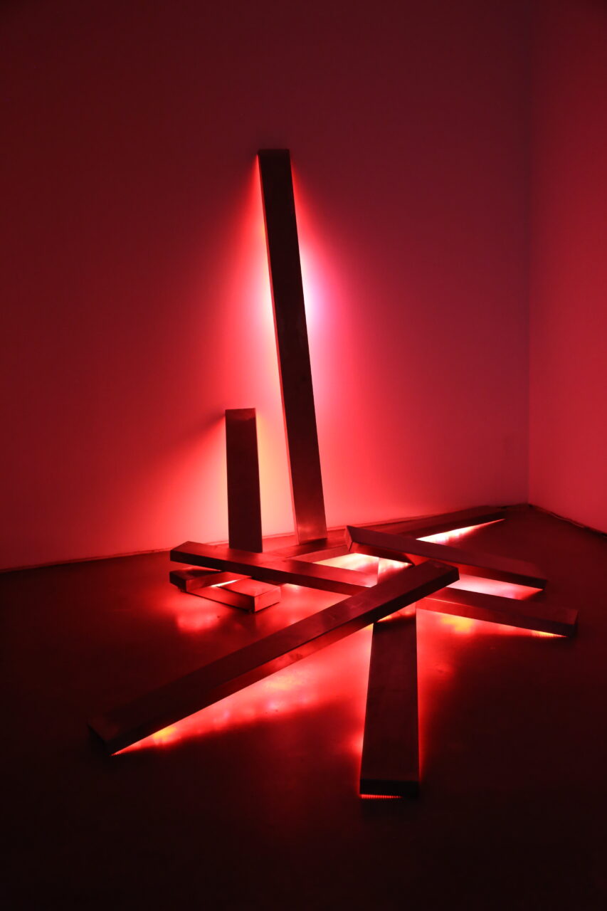 Instalación. Estructura de metal, panel LED, componentes electrónicos, software generativo personalizado, datos en tiempo real, conexión a internet.