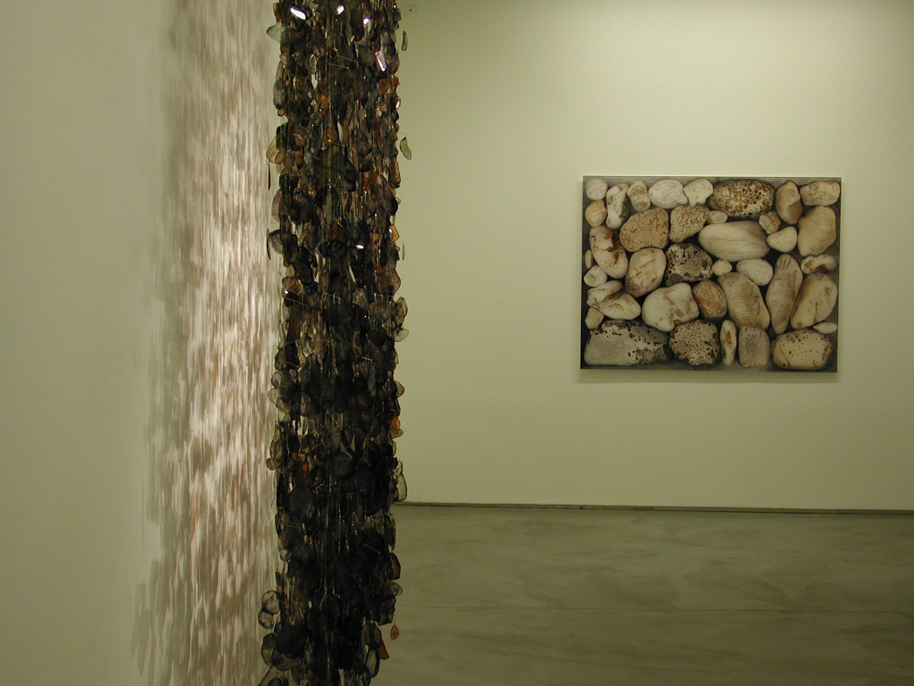 The way in which the works interact perceptively and in which they are laid out spatially configures a laboratory in which the diverse mechanisms of vision operate, interfering with the real object in multiple planes of transference and simulations: the “cascade” or curtain, sample of hanging elements or stone-organs that have lost their materiality, in an ambiguity between obscurity and transparency in which front and back do not exist; magnifying glasses, scientific instruments equipped with tweezers that grip the (image of) the stone to focus on it and examine it, with the intention of exercising absolute control, a maximum precision, in an attempt to penetrate the invisible, what is beyond the reach of the eye, reaching a monstrous vision, prostheses of sight, “seeing more”; photographs, flat containers of an order that records, classifies and files dreams, symbols, words, signs and myths, ideas and cultural legacies inscribed in false, perspex or paper, geological matter, boxes that guard and confine the pre-history of the memory of language and psyche; the real stone, an object removed from its context and placed on the wall, impenetrable surface and screen that receives symbolic projections; the flow of a vital element – water – in which the body floats static and inert, constantly moved by the current. Copies, reproductions, transcriptions in which the de-materialised, de-located stone-object is evoked musically, through the crystal of a magnifying glass, by the words of a Bob Dylan song, Rolling Stone. And it rolls from place to place with the sound of the water that drags it along, slowly, with a diffuse perception, as if it were a dream, and no longer real.