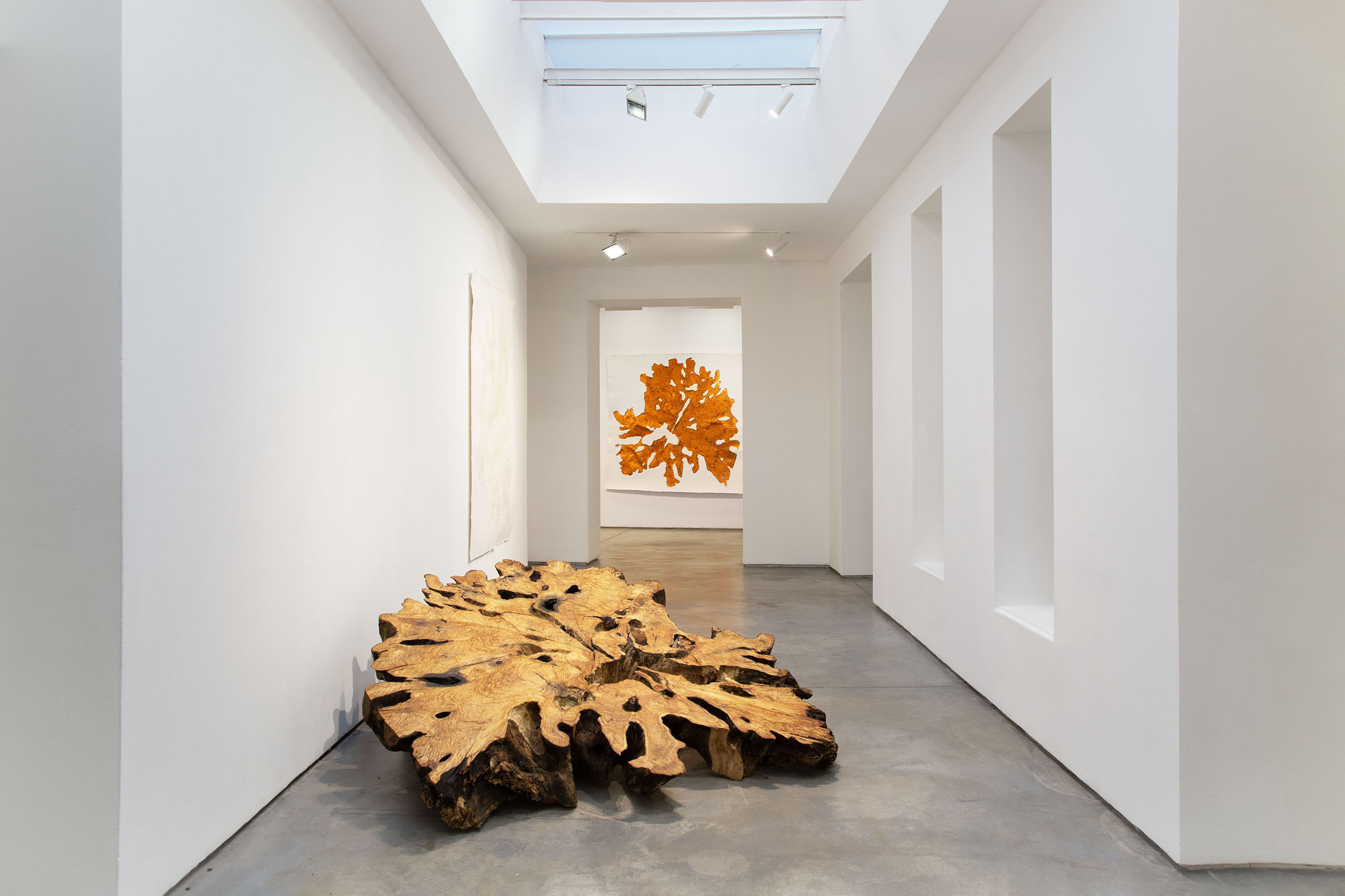 Max Estrella presents Miler Lagos’ second solo exhibition at the gallery. The Colombian artist showcases a series of etchings created using the intaglio technique, made from horizontally cut tree trunks. Lagos has managed to include a section of a Calabrian olive tree trunk, 1,800 years old, which, after suffering damage during transportation, was located and recovered by the artist. A symbol and witness to the passage of centuries in the Mediterranean, the olive section represents a fragment of history that the artist incorporates into his work. Using a press that leaves an imprint of the tree, the works become tangible traces of time, exploring the relationship between man and the natural world.