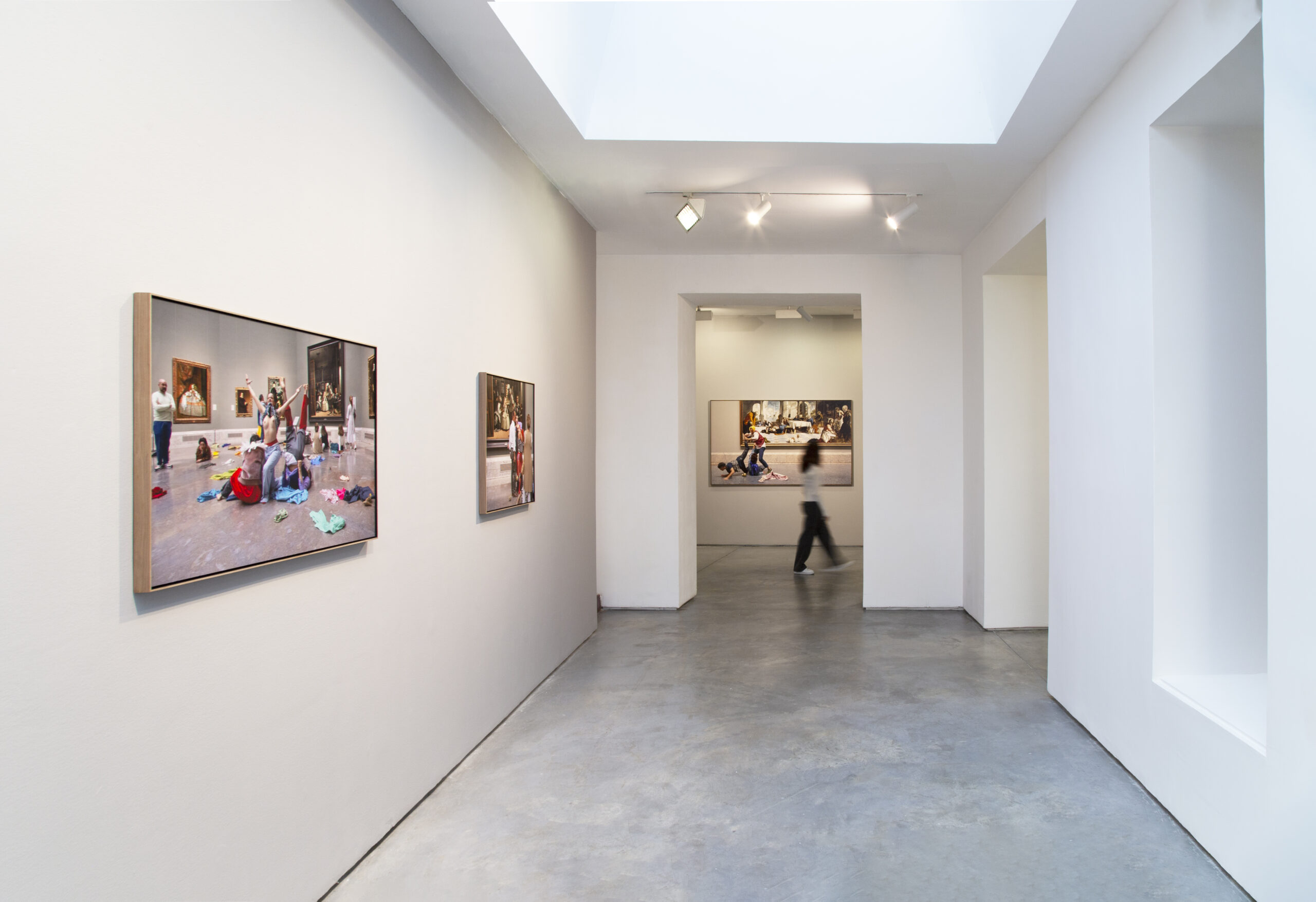 The action at the Prado represents an extraordinary twist to LaBOLA performed in her solo exhibition A escala humana at Alcalá 31 in 2022. The presented images create a communion between the different spatial dimensions of the performers, the audience, and the paintings in the gallery. The result is a disconcerting rarity; everything happens in reverse. The audience doesn’t look at the paintings but at “occupants” exchanging clothes and objects. The attendants, overwhelmed by the event, try to protect the works on the walls. However, La Ribot’s edited images show that Velázquez, Tintoretto, or Veronés collide with LaBOLA formed by dancers Ludovico Palladini, Piera Bellato, and Mathilde Invernon, and all of them, in turn, collide with the bewildered visitors. No one looks at the camera because, in reality, these are not photos; they are living paintings. The twenty-five images displayed at Max Estrella immortalize an unrepeatable moment.