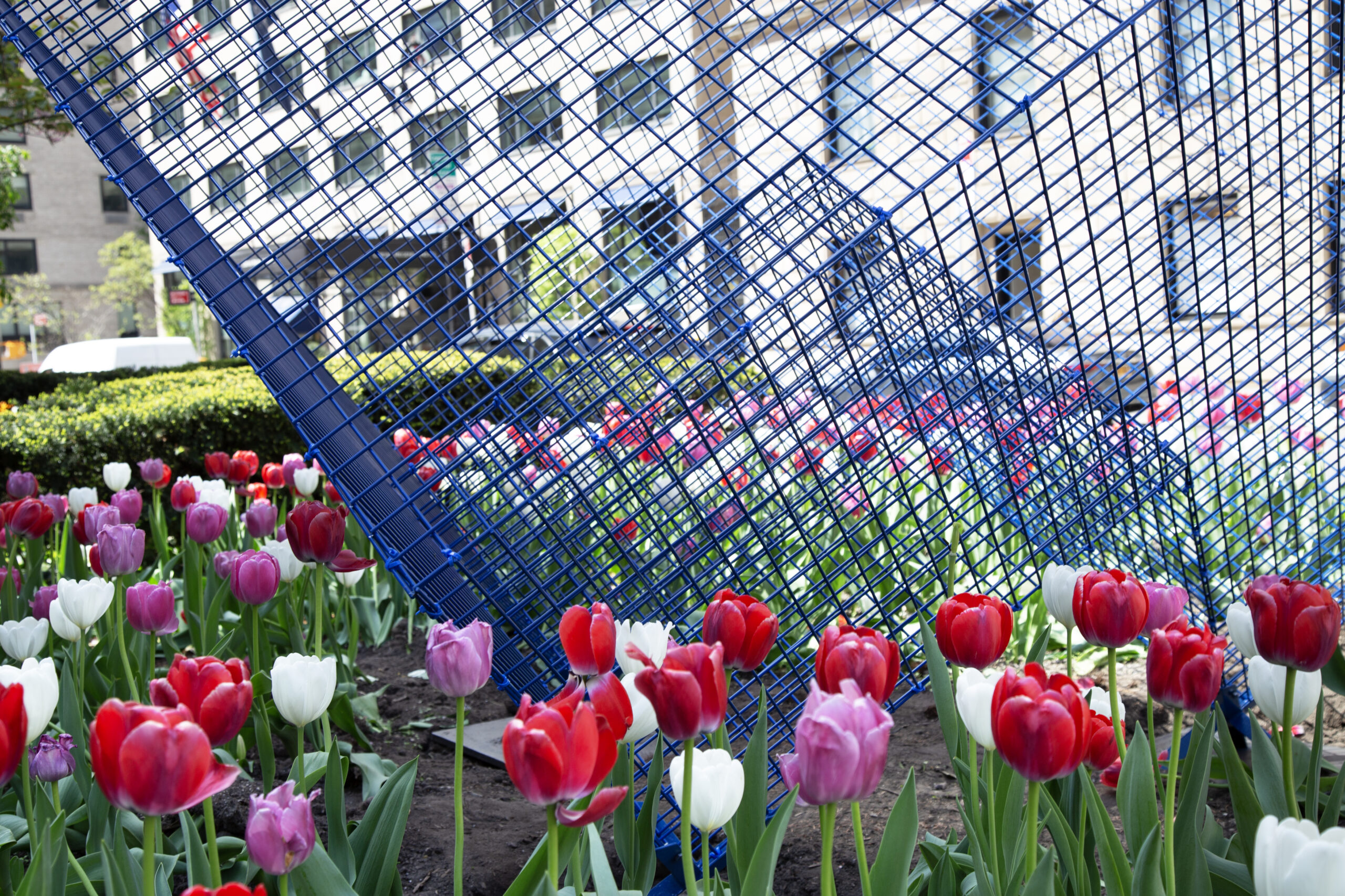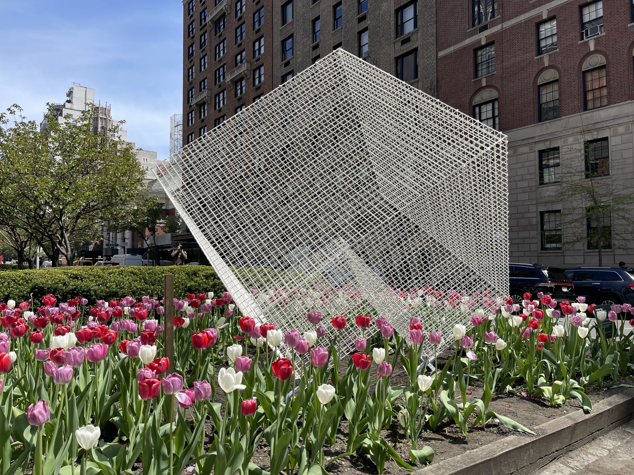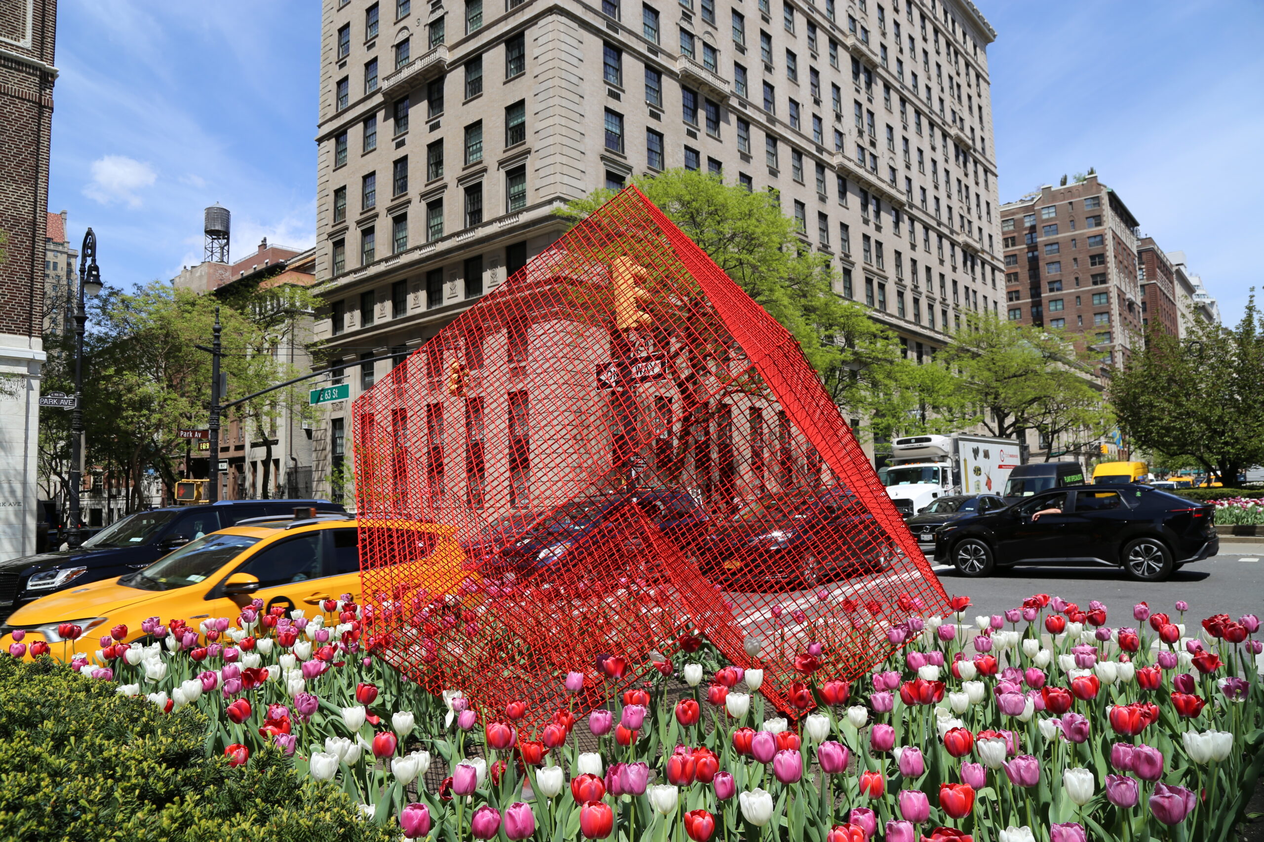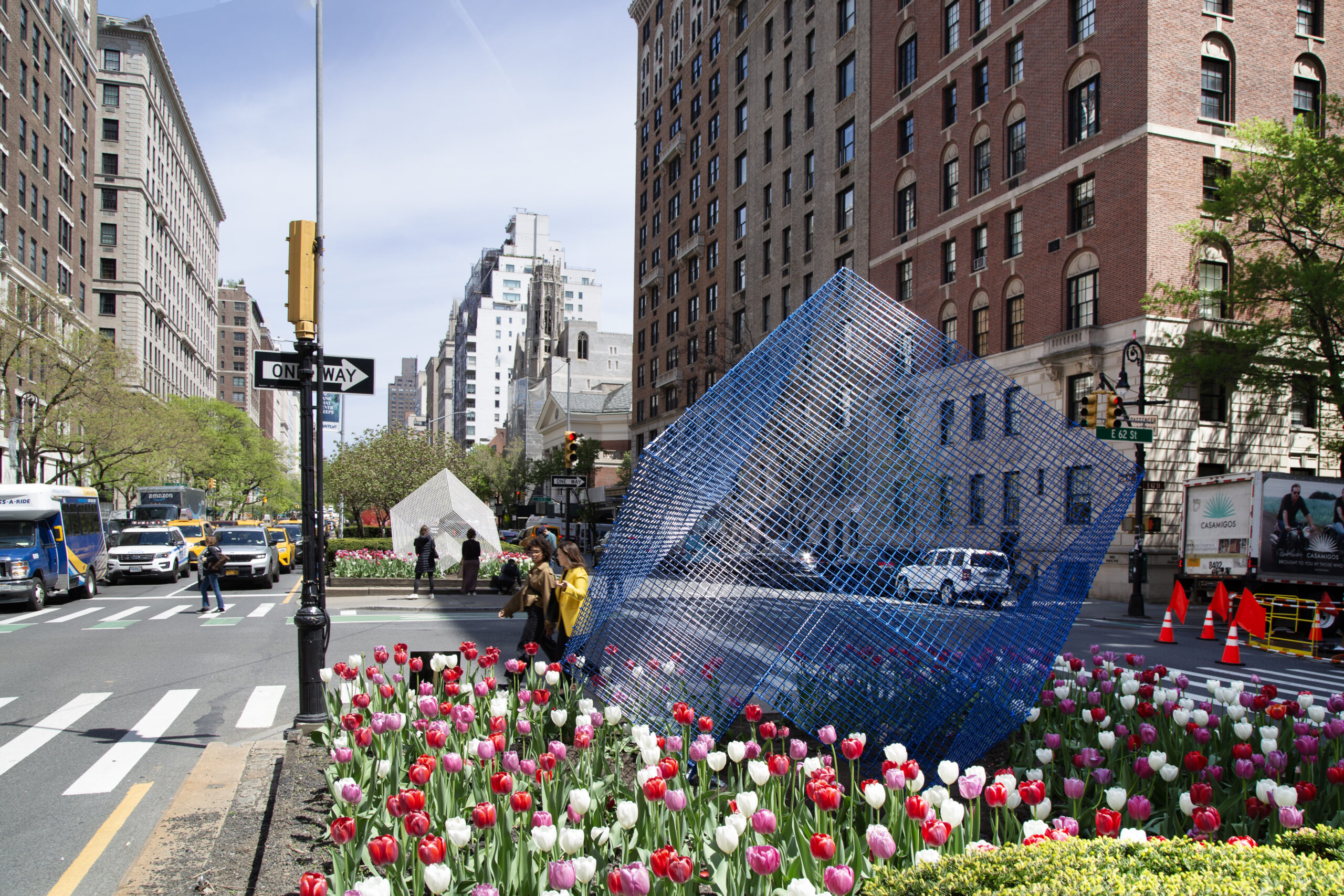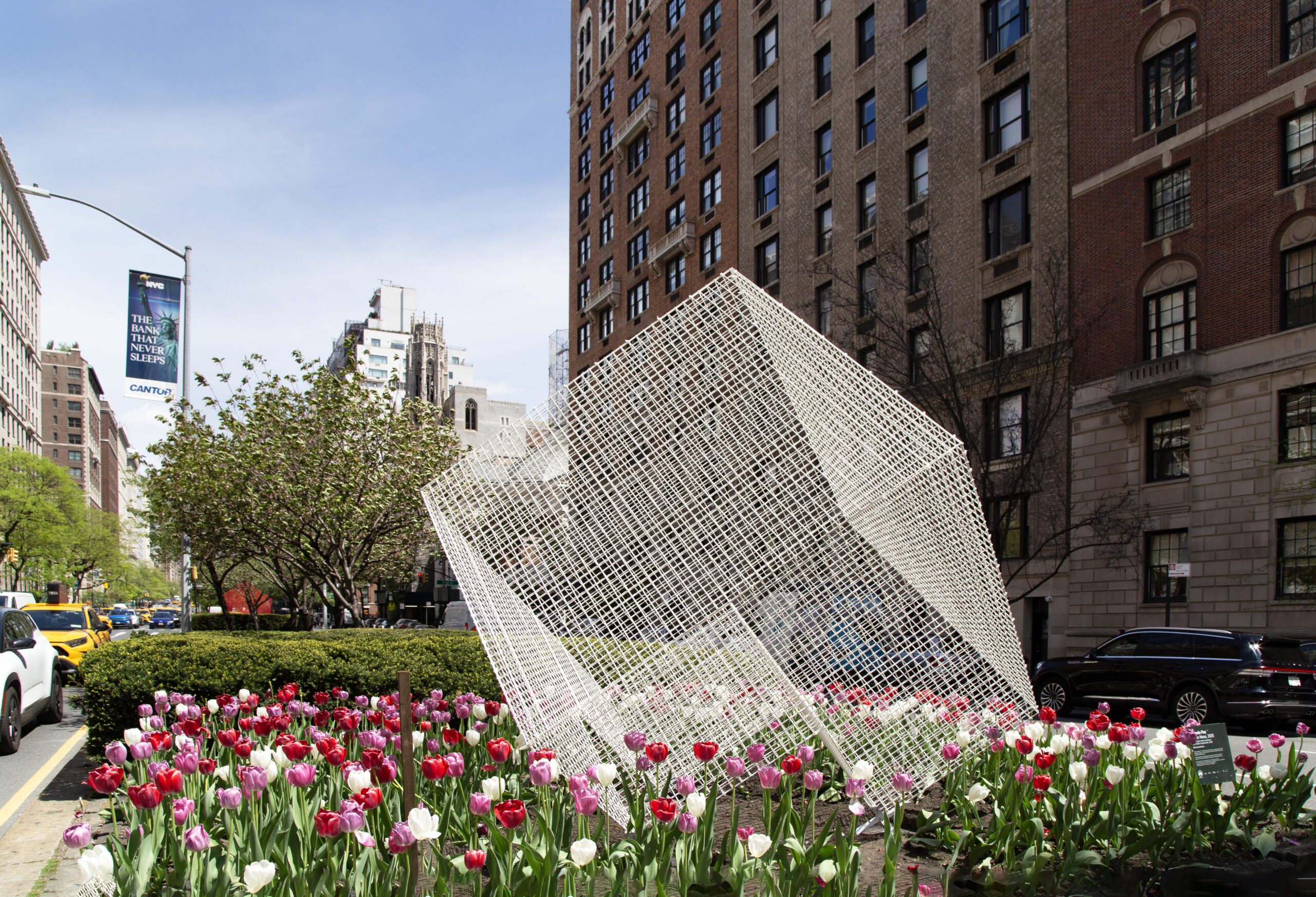 In addition to ‘Cathedrals’, the exhibition will include four striking metallic sculptures. Among these is a red version of ‘Transparencies’, a piece that allows the surrounding cityscape to filter through it, creating a stunning visual interplay. Completing the exhibition are three variations of Paz’s NASA series, in white, blue, and red, referencing the colors of the American flag. These intricate sculptures, designed as three-dimensional metal grids, echo the geometric patterns of New York City’s streets and buildings, further reinforcing the deep connection between the artist’s work and the urban landscape.