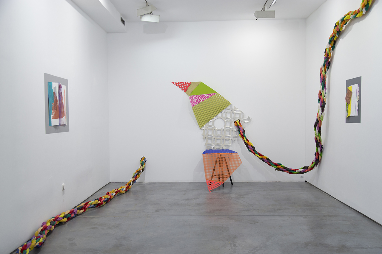 Max Estrella is delighted to present Jessica Stockholder’s (Seattle, 1959) most recent work. The exhibition is titled Tied to be fit, and includes a series of pieces named Corona Homeworks and the installation Assist: Tied to be fit – Middle Period, which gives the exhibition its title.