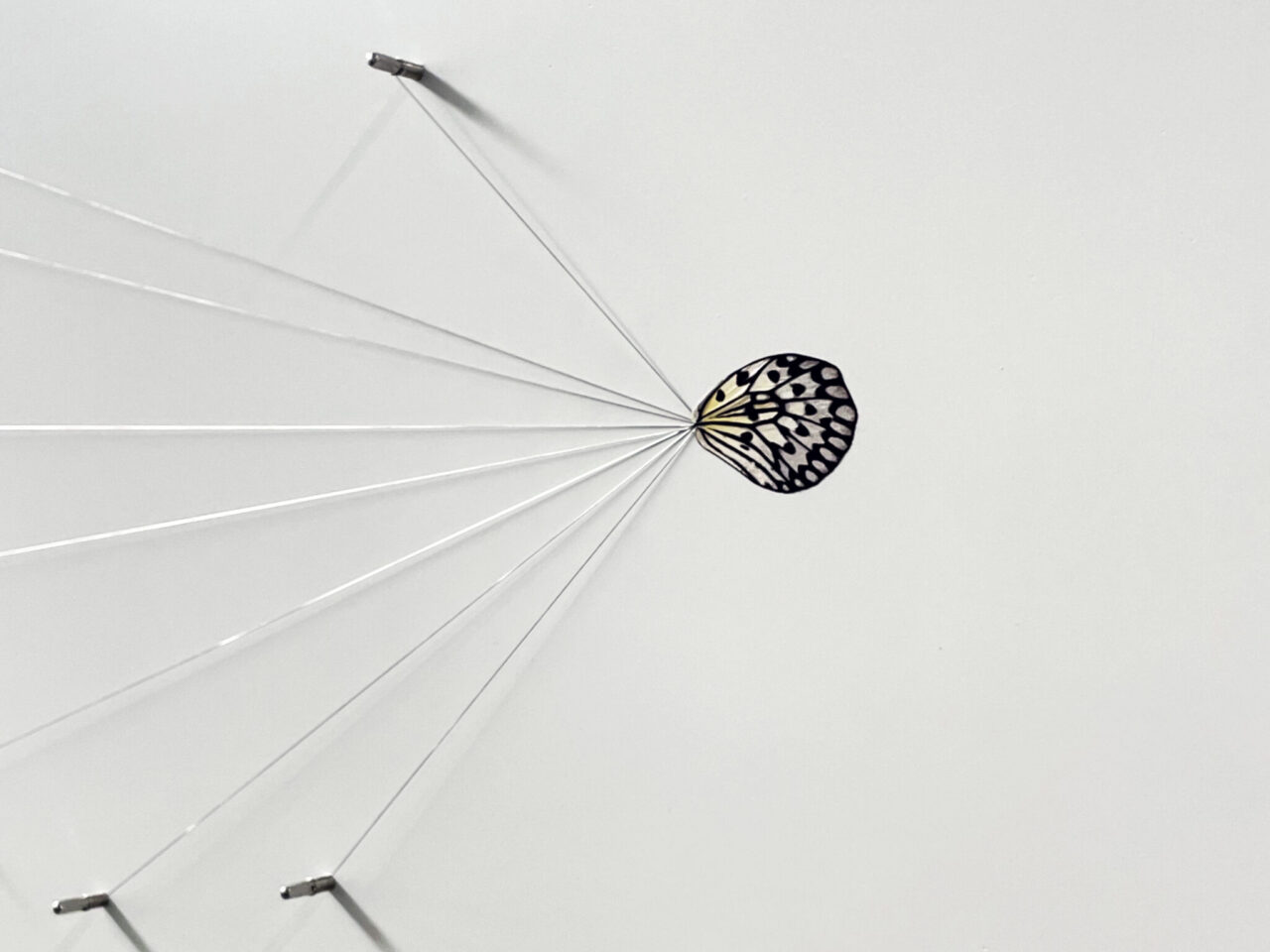 Butterfly wing, guitar strings, tuning pegs, enamel, wood.