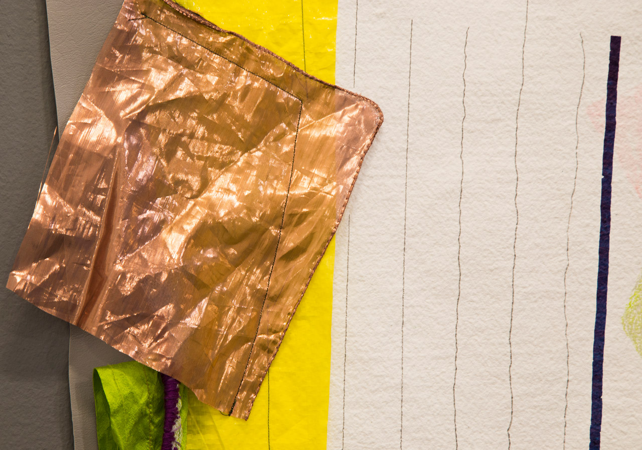 Paper, fabric, colored pencil, ink, embroidery thread, tulle, plastic tarp