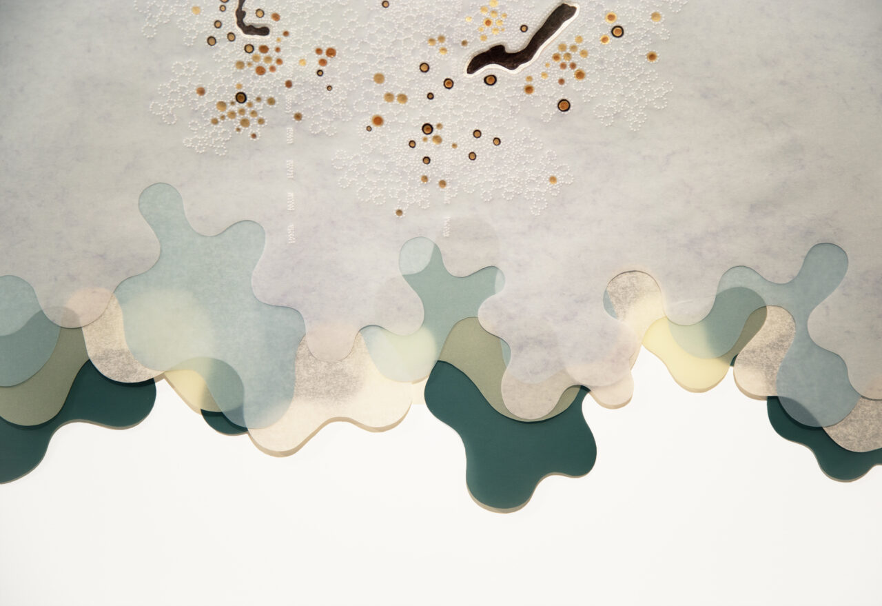 Ink, oil and hand perforating on vellum and paper