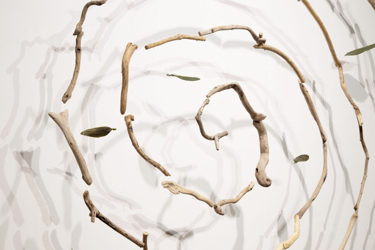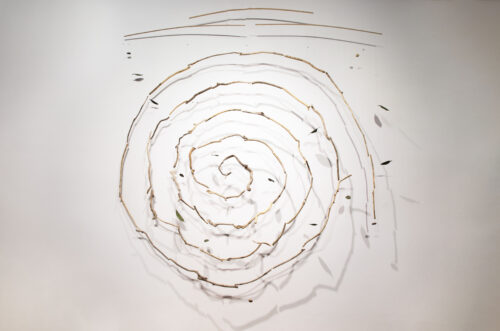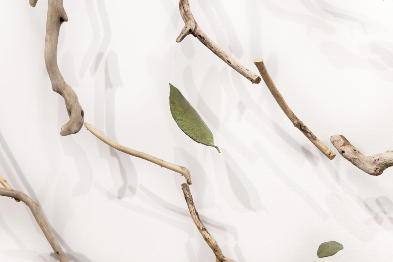 kinetic sculpture, sticks and leaves in bronze