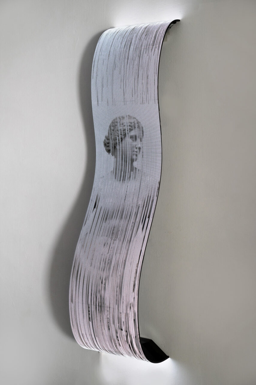 Flexible LED screen, metal structure, computer, generative custom software, real time data, internet connection.