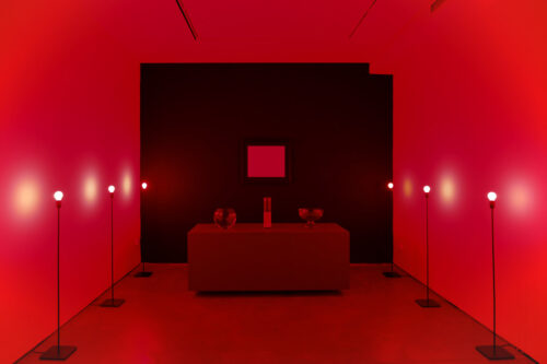 Installation. Dark Room with red security lights, lamp holders, high table, 3 glass recipients with developing liquids, latent image exposed and framed, audio with 3 voices.